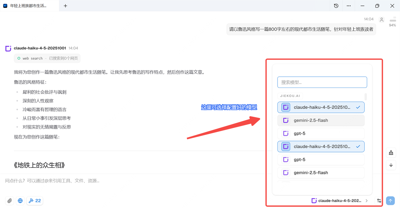通过对接 JieKou.AI,你可以轻松接入多种海内外大模型,包括 Claude-haiku-4-5、Gemini-2.5-flash、Gpt-5以及其他兼容模型,享受更高的灵活性和扩展性。